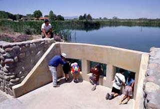 San Solomon Springs at Balmorhea State Park fill a ‘cienega’ (desert wetland) and the canals of a refugium are home to endangered species of fish, assorted invertebrates, and turtles. The pool differs from most public pools in several respects: the 1 3/4-acre size, the 25-foot depth and the 72 to 76 degree constant temperature. It also has a variety of aquatic life in its clear waters. With a capacity of more than 3 1/2 million gallons, the pool has plenty of room for swimmers, while offering a unique setting for scuba and skin diving.