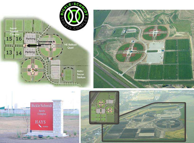 Construction of the Bickle/Schmidt Sports Complex began in 2010 and completed in the fall of 2011. This brand new facility sits on 120 acres of ground and is located just northwest of Gross Memorial Coliseum on the western edge of Hays at the intersection of Old Hwy 40 and the Hwy 183 by-pass. It is the home of the Fort Hays State University soccer stadium and features some of the best recreational facilities in western Kansas. The complex includes eight (8) baseball/softball fields with 300′ fences, bullpens, two (2) concession/restroom facilities, covered spectator seating, playground features and state of the art ball fields and lights. Also, it is home to the Nex-Tech Wireless soccer/football fields which include eight (8) full size soccer/football fields and concession/restroom facility. The sports complex accommodates both youth and adult softball, baseball, soccer and football tournaments in addition it is home to the Hays Recreation Commission youth and adult league games for all outdoor sports.