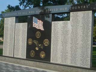 Made of black and gray granite, the memorial is over 16 feet long and 9 feet high with over 200 names of veterans as well as their branch of service and years served. Over 200 pavers in front of the memorial have dedications to family members, businesses, and civic organizations. Phase two is beginning in September, 2008, with the addition of another sidewalk, pavers and walkway behind the memorial, and lighted flagpoles. Inscriptions and names on the pavers are still being added.