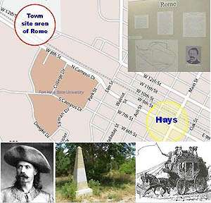 Simon Motz, an early citizen of Rome, who then became the first Hays mayor, arrived in Rome in June 1867. At that time, records tell of a two story hotel being built by Joe Perry, a 4 room house and a large stone business under construction by Cody and Rose. A week later, according to Motz, Rome had a population of 500 and his description of Rome as a “tent city” indicated that most of the businesses were probably canvas structures. When the Butterfield Stage Line opened a station in the Perry House, the future of Rome seemed good, but cholera hit that summer and decisions made by the railroad did not help the fledgling town. W.C. Webb, who apparently had the authority to locate depots for the Union Pacific Railroad Eastern Division, began selling town site lots east of Big Creek. This rival town company of Webb and a man named Phinney Moore, had wanted to be made partners with Cody at the Rome town site, but when Cody refused, they encouraged the development of a new town approximately a mile east of Rome. By July of 1867, Rome had over 2,000 citizens and continued to grow until August when the town of Hays City was established. By the time the railroad arrived in October, many of the businesses of Rome had already relocated to Hays City or farther west along the railroad. The last businesses moved out of Rome in the spring of 1868. Visitors to this location will see the stone marker on the western outskirts of Hays that shows the approximate location of the Rome town site. There is a bronze historical marker that provides a information about Rome, and nearby is the railroad bridge crossing Big Creek that was once known as “Hangman’s Bridge”, the site of several hangings in the early days of Hays City. Those who care to explore the area around Big Creek and the Rome location will find hiking trails that cross beneath the 12th Street Bridge and south through the Fort Hays State University Campus.