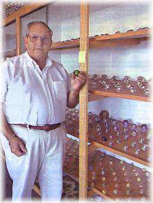 Lee Batterton’s collection of hand-made marbles come in all colors and sizes and date from the late 1800s to early 1900s. They have picturesque names like Peppermint Swirl, Clam Broth, Brick, and Indian Skin. Batterton’s favorite is the rare Lutz marbles with gold-colored powder inside. Glass cases lining two long walls display the more expensive ones, while, overhead, hundreds of quart jars filled to their brims with agates