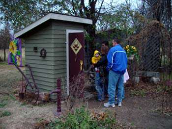 The first stop of the tour is in the one block long downtown at the Outhouse Tour Hdqrs. A nice young woman from Howard, Kansas sold me an Outhouse Button, ballot and map for $1. The few blocks of the small community had several yard sales, 11 competing outhouses, a quilt show, arts & crafts, horse drawn wagon rides and live music at Elk Falls Pottery.