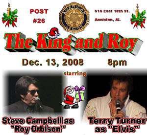 Nationally acclaimed Elvis and Roy Orbison tribute artists, Terry Turner and Steve Campbell bring their talents to the American Legion Post #26 in Anniston.