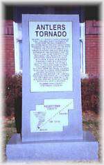 On April 12 , 1945, at 5:20 pm, a tornado first touched down southwest of town near the Hall communtiy. At 5:45 pm, one of the most devasting tornados in the history of the state struck the city of Antlers with a of nearly one half mile wide. Entering the southwest part of the city and going through to the northeast destroying with few exceptions every physical object in its path. A total of 69 people eventually died as a result of injuries received in the storrm. A total of 243 people were injured, 375 homes were destroyed, 250 buildings were destroyed,