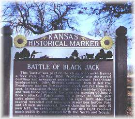 This battle was part of the struggle to make Kansas a free state. In May, 1856, Pro-slavery men destroyed buildings and newspaper presses in Lawrence, Free-State headquarters. John Brown’s company then killed 5 Pro-slavery men on Pottawatomie Creek not far from this spot. In retaliation Henry C. Pate raided near-by Palmyra and took 3 prisoners. Early on the morning of June 2, Brown attacked Pate’s camp in a grove of Black Jack Oaks about 1/4 miles south of this sign. Both sides had several wounded and numerous desertions before Pate and 28 men surrendered, Brown claiming he had only 15 men left. As evidence of civil war, this site received much publicity, and excited both the North and South.