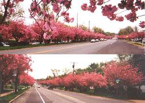 In Cherry Hill, NJ toward the last two weeks of April — you can see a continuous two-mile avenue of blossoming cherry trees (Kwanzan Variety) that are adorned with American flags and yellow ribbons in remembrance of the 2996 innocent victims that perished on September 11, 2001 and to reflect proud support of our military. Cherry Hill Firefighters and American Legion Post 372 War Veterans sponsor this annual attraction called – Cherry Hill’s -“9-11 Remembrance & Patriotic Gratitude” event! You can see this patriotic cherry blossom attraction by clicking on any of the several links on our web site.