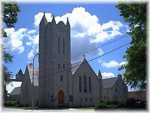 This church listed on the National Register of Historic Places is an Early Gothic piece of architecture whose cornerstone was laid in 1889. The castellated bell tower forms a very prominent feature, being fifteen and one half feet square and eighty-two feet high. The stair to roof is designed in the form of a turret, circular at the base and octagonal at the top. Another outstanding feature of Christ Church is its unique treasury of stained glass window art. The signature red-tiled crosses that span the roof have captured the attention of generations.