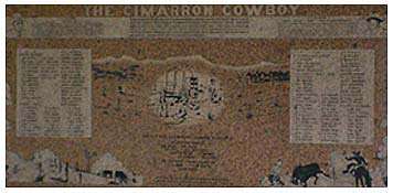 The monument is actually a story about the Cimarron cowboy told in pictures. Murals etched into the marker depict the following event in area history: