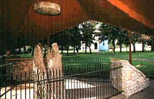 A shelter east of the Neosho River bridge protects the stump of the Council Oak. Gathered in the shade of the big oak on a hot August day in 1825, agents of the Osage tribe and the U.S. government signed a treaty giving Americans and Mexicans safe passage along the Santa Fe Trail through Osage territory in return for $800. (At that same time, the city was named for its role as a council site for treaty negotiations and its extensive grove of hardwood timber.) Before the Council Oak blew down in a windstorm in 1958, the tree stood 70 feet tall and measured 16 feet around.