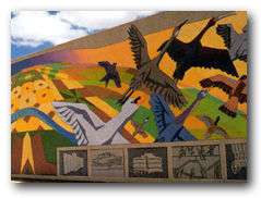 Migration is located at the corner of Main & 16th Streets. The mural was conceived and completed by local high school art students and depicts elements of Great Bend’s culture along with a spectacular representation of water fowl in flight over a quilt pattern of farm land. Comet Hale-Bopp also makes cameo appearance in the mural since it was visible while the mural was being painted.