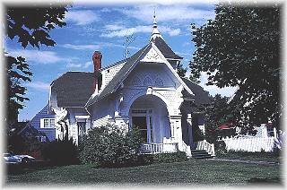 The Hanson-Downing House, built in 1886, is an excellent example of the American ornamented cottage. The asymmetry of forms, variation in roof sections, and textural variety create a picturesque effect and demonstrate the versatility of wood as a building material. The house was built by Charles E. Hanson and later sold to Wallace A. Downing. Both were businessmen in Kearney.