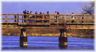 The Hike-Bike Bridge at the Fort Kearny State Recreation Area is an excellent crane viewing location open to the public. The viewing location is an easy 1/3-mile walk from the parking lot and is wheel-chair accessible. The bridge is open to the elements, so dress accordingly. The best times to arrive to view cranes are one hour before sunrise or one hour before sunset.