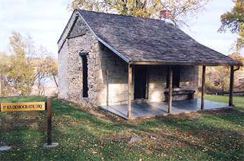 This stone building was the headquarters of the Democratic Party during the Kansas Territorial period (1854-61). The cabin was used during a time when Lecompton, known as “The Birthplace of the Kansas Democratic Party,” was the territorial capital and stood at the center of national attention. Within these walls ambitious and influential men gathered to discuss issues, plot strategies, and make decisions that helped to shape the destiny of Kansas politics and government.