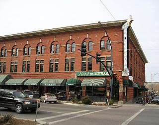 The cornerstone of historic “Whiskey Row,” Hotel St. Michael, listed on the National Register of Historic Places, represents the coming of age of Prescotts hostelries. Constructed on the site of the modest Hotel Burke, which burned in 1900, the new three-story hotel was designed by D.W. Millard in the Second Renaissance Revival Style. Built of brick and stone, it is decorated with stone faces or “gargoyles,” which allegedly represents crude images of local politicians.