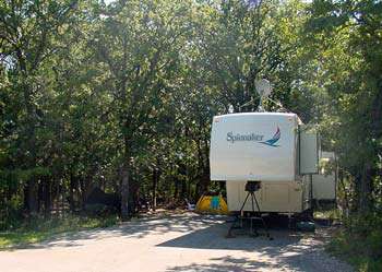 Camping is permitted only at Cedar Hill State Park and Loyd Park. Each individual campsite is restricted to no more than ten persons and two camping structures. Only one of the structures may be a RV, travel trailer, pop-up camper, etc.. For example, campers may have two tents or one tent and one RV, but an RV and a travel trailer may not occupy the site at the same time. Vehicles parked at a campsite should not exceed the physical limitations of the site. Overflow parking areas are provided in each park for extra vehicles.