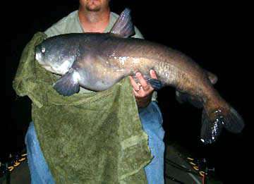 Channel catfish angling is best in the early summer when fish head up tributary streams to spawn or get in the rip-rap along the dam. Try cut bait, shrimp, or stink bait fished still or dragged along the bottom with the wind; also known as drift fishing. Blue catfish bite best in the winter and the bait of choice is live shad or sunfish. Drift fish deep, open-water points.