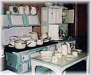 Kitchen and other rooms from the 1900s to the 1950s are on display. Each period had its own type of enamelware. Red and white were popular in the 1940s, while green and tan were popular for kitchen utensils in the 1930s. Gray and spatter stoves and enamelware were found in the early 1900s. Amongst the glassware is 5,000 pieces of depression glass, a beer sign collection, and McCoy pottery.