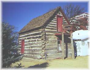 The two-story log cabin now located just south of the Ellis County Courthouse on the Courthouse lawn, built of cedar logs was originally built in Ellis County near where Joe Pyle Canyon and Spring Canyon intersect.