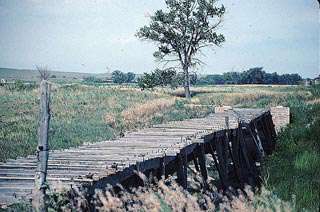 The Kimball County Irrigation District Board held its first organizational meeting in November 1909. Subsequent meetings resulted in plans for an irrigation system. The design of the canal called for a reservoir, and a north and south ditch. Because of the rough topography a number of aqueducts were required. The aqueducts used on this canal are of particular significance because the flumes used in them were manufactured in Kimball by Patrick Maginnis. He began building flumes used in aqueduct systems in the late 1890s, but his initial attempts resulted in crude and expensive products. After additional refinements, however, he developed the Galvanized Steel Flume that was patented on May 20, 1902. Although there are other aqueducts in the region they do not retain the high degree of integrity of this aqueduct. Listed on the National Register of Historic Places, it is an exceptionally well preserved example of a type of early twentieth century engineering that was essential to the irrigation system in areas of rough terrain.