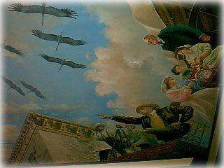 The mural on the ceiling of the opera house includes fiber-optic lighting which gives the people below the mural, a stars-in-the-sky effect.