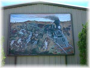 This mural painted on the building across the street from the old depot depicts the introduction of the railroad into this open range territory.