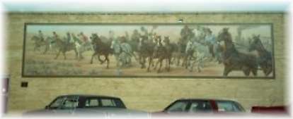 A Wintery Homestead SceneSouthwest wall at 6th and College "Burning of the Castle on the Hill", 1935 - artist, Stan Herd, 2000Located east of the Courthouse Square How exciting to catch this mural in its creation, from it's sketches to the partial application of the bright paints. See if you can distinquish the "real" artist from the artist in the mural! - Artist, Roger Cooke, Sandy, Oregon Roger Cooke Fine Arts 503-622-4228 Located one block east of the Courthouse Square on the west side of the intersection.