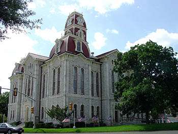 After three previous structures were destroyed by fire, the present Parker County Courthouse was begun in 1884 and dedicated in 1886. Designed by architect Wesley Clarke Dobson of Waco who designed nine other Texas courthouses, the Victorian building is constructed of limestone quarried locally at a cost of $55,555.55. The seal inside marks the exact center of the county.