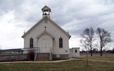 The original building was destroyed by fire in 1918 and was immediately rebuilt. It holds a rich history of Sunday services, marriages, deaths, ice cream socials and watermelon feeds. It officially closed in 1993. To save it from being torn down its members sold the building to the Tonganoxie Historical Society on June 9, 1993 for $1.00 and paid for the cost of moving it to the Historical Site in the spring of 1994.