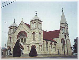 The main lines of the structure are cruciform in plan. The outside length of the church measures 134 feet; width of building with transept, 77 feet. All the half-circle arches over openings are trimmed in red brick to enhance the beauty of the limestone structure; blue, earth brown, and white glazed face brick adorn each side of the three front entrances and the area under the large window in the front of the church. Two small entrances are at each end of the transept. The gallery is at the west (front) of the church. The spired bell tower, topped by a gilded cross, rises high above the sanctuary. Two towers, not as high as the steeple, flank each side of the main entrance. Three large, arched, glass windows one in each transept and one above the entrance to the church adorn the edifice. The arched portion of these windows give the appearance of a half rose window. The seating capacity was designed for over 900.