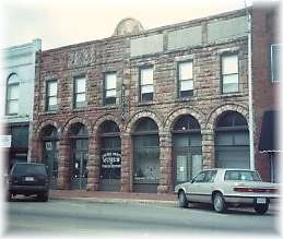 The oldest commercial buildings in Lincoln County, these sandstone “twin” buildings were built by pioneer merchant, A.E. Macho in 1897 and 1898. The earlier building was first constructed in 1896 and was demolished in the cyclone but rebuilt almost immediately. The early builder constructed three buildings at the turn of the century featuring these 15 foot high Roman arches of native stone.