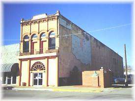 Originally the “Boston Store” built in 1894 and it was one of the first permanent buildings of stone on the square. Listed on the National Register of Historic Places, it was erected by Adolph Wolleson and A.C. Nicewander, both early day businessmen. Wolleson, a merchant sailor from Denmark is credited with influencing the building design using naval motifs. Gargoyle head and leaf figures accent the Romanesque arched windows. The first floor facade has been altered with stucco panels covering the original recessed entry store front.