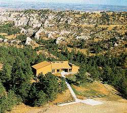 The center’s split-level design takes advantage of the hilltop location with little intrusion on the scenic site, and the building’s windows are deeply tinted so visitors can closely observe birds and other wildlife coming from the forest to use feeders and plantings along the building’s north side. Windows and observation decks extending along the building’s north and east sides overlook the pine forest and the North Platte Valley and Scotts Bluff National Monument.