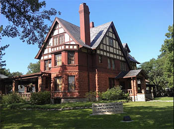 This house, a National Historic Register Landmark, was rented by William Allen White in 1899 and purchased by him in 1901. It was his home for 45 years. The two-and-a-half-story house features rough-hewn red sandstone ashlar on the first floor exterior walls with matching red brick stretchers; stucco and simulated half-timbers make up the second and attic levels. The red sandstone exterior gives the house its name, “Red Rocks”.