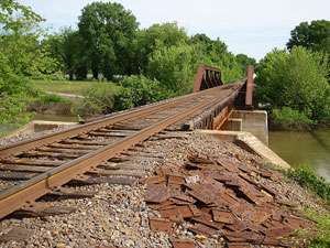 Built in 1874 this bridge which spans Rock Creek and is now on the National Register, is the oldest known wrought iron span in Missouri. It is the same age as the Eads Bridge in Saint Louis. The Keystone Bridge Company constructed this bridge to be placed across the River des Peres at Ivory Avenue. It remained there until 1928 when it was replaced by a new bridge. The bridge was moved to Kimmswick and put in place in 1930. The bridge is only open to pedestrian traffic.