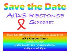 AIDS Response is having their Annual Spring Event…. ARS Garden Party at the Hilton Garden Inn in Portsmouth. The event begins at 6:00pm. There will be light horsd’Oeuvres, Dancing to DJ, Silent Auction, Cash Bar and Casual Dress and a Chance to Win a Timeshare Ownership! For tickets call Nancy 207-337-5115, or contact AIDS Response Seacoast.