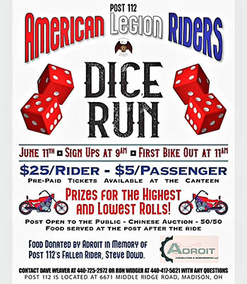 American Legion Riders Post 112 in Madison Ohio is holding its first Dice Run. This will be open to the public. Sign ups are at 9am with the first bike out at 11am. Prices are 25$ per rider and 5$ per passenger. There will be a Chinese auction 50/50 and food served after the ride. There are also Prizes for the Highest and Lowest rolls!