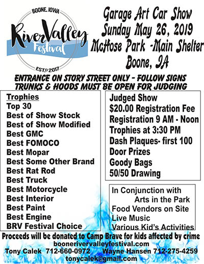 The car show is in conjunction with the Boone River Valley Festival. Food vendors on site, live music, and on site kids activities.
