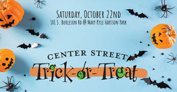 The City of Kyle Parks and Recreation Department invites you to Center Street Trick-or-Treat on Saturday, Oct. 22, from 12 p.m. to 3 p.m. at Mary Kyle Hartson City Square Park, 101 S. Burleson Rd.