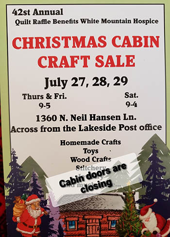 Christmas Cabin Craft Sale has been going on for 43 years in the White Mountains of Arizona. This will be our final show. Cabin doors are closing forever.. It’s held at the Lakeside Community Gym in Lakeside, AZ. July 27th-29th, 2023. Homemade crafts, toys, wood crafts, stitchery, and much more. A quilt raffle is held in conjunction of the show that benefits Hospice of the White Mountains.