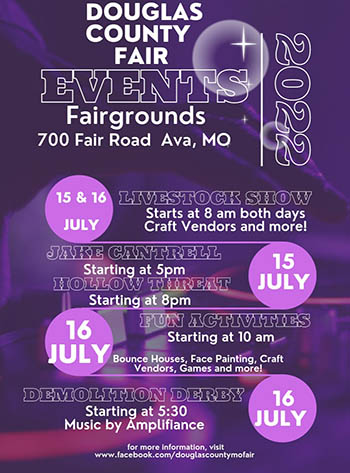 We will have a Livestock Show, Face Painting, Bounce Houses, Live Music, Craft Vendors, Games, Lawnmower Derby, Little Tykes Derby, Bone-Stock Derby and a Semi-Stock Derby! Fun for everyone! More information and daily schedules can be found at http://www.facebook.com/douglascountymofair