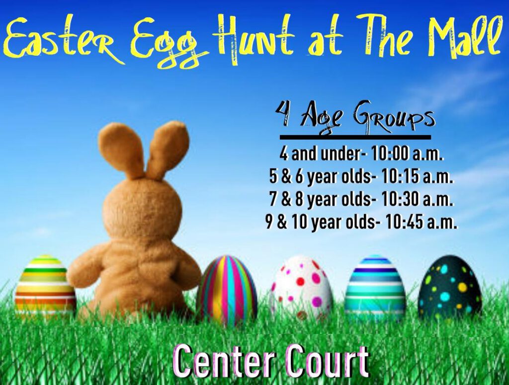 Bring the kids to the center court at the Mall on Saturday at 10 am for the Easter Eggs Hunt. Lots of prizes with 4 age groups.
