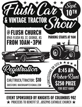 A poker run at the Flush Car & Vintage Tractor Show will begin at 8:45, and the route will include five stops with a total drive time approximated at 40 minutes. The winning hand of the poker run will take home $250.00! Parking for the car show will begin at 9am, and the show will run from 10am-3pm. Concessions stand with various lunch options provided, proceeds to benefit St. Josephs Catholic Church.