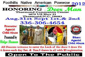 The Annual Foothills Native American Powwow honors all Veterans men & women of all Nationalities Including Indians & Native Americans. Open To The Public of all people. The Powwow is held annually Labor Day Weekend Friday, Saturday & Sunday. Powwow s Against child Abuse is joining Bikers Against Child Abuse, Blue Star Mothers Against Child Abuse, Rolling Thunder Against Child Abuse.