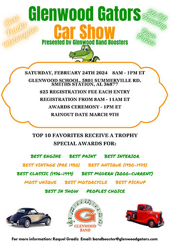Glenwood Gators Car Show benefiting the Glenwood Band. 50/50 raffle, door prizes and food trucks. Top 10 favorites receive a trophy.