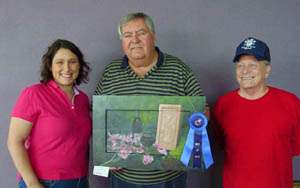 The Ozark Brush & Palette Club has a new Gallery Exhibit of paintings at the 1st National Bank of Camdenton. The “Best of Show” Blue Ribbon award went to Wayne Doornbosch. There were various other Honorable Mention ribbons also awarded. Pictured are (left to right) Judge Rebecca Seward, owner of the “Vine” Gallery & Restaurant in Osage Beach, winner Wayne Doornbosch, and the Gallery Manager, Bob Barker. All paintings are for sale and can be viewed during regular banking hours.