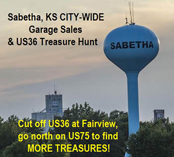 Continue your US36 Treasure Hunting Trip by shopping SABETHA’S City Wide Garage Sales!! Sabetha is just a few miles north off US36, jaunting north on US75. Hope we see you there.