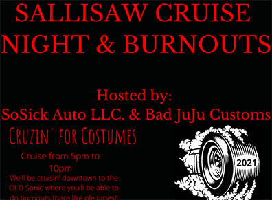 Welcome to the 4th Sallisaw Cruise Night and FINAL one of the year. WE ARE CRUISIN’ FOR COSTUMES. I’m hosting the Burnout Contest at the Old Sonic next to AutoZone and it’s $5 to enter. You can register on location at AutoZone starting @ 3pm and deadline will be at 4:30pm. If you want, I can send you a copy of the registration form, you print, fill it out, and turn it in before the deadline. If you have any questions, text me anytime 9183159077. Burnouts and Cruise will start @ 5pm and Burnout will end around 8pm, Cruise will end around 10pm. If you would like to donate Halloween Costumes for this cause to help out a family whom may not be able to provide one for their own, then PLEASE partake in this cause and you can drop-off at AutoZone where I’ll be setup or at The Car Meet/Cruise In.