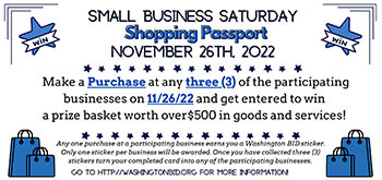 The businesses who donated to the prize basket are your participating businesses for the Small Business Saturday Shopping Passport! You can pick up a shopping passport at any of the participating businesses on Saturday, November 26th. Make a purchase at any of the locations listed on the card on Small Business Saturday and get a Washington BID sticker. There is no minimum purchase price. Collect a sticker from three locations to complete the passport, one sticker awarded per location. Once a card is completed fill out your contact information on the back of the passport card and submit it to any of the participating businesses. That’s it! You are now entered to win! Once you complete one card you can start over visit three NEW businesses to have another chance to win. Shop at three unique stores get one entry, shop at six unique stores get two entries, and so on. The more you shop the better your chances!