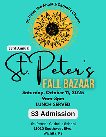 Come join us for the 33es Annual St Peter Schulte Fall Bazaar with over 100 artisans at St. Peter Catholic School on K-42 between Maize and McArthur Road.