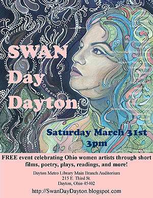 Building off of the success of last year’s inaugural standing-room only event, SWAN Day Dayton 2013 will be held on Saturday March 30th at 2pm. Join artists and community members in a celebration of Ohio female artists. The showcase is free and includes films, poetry, plays, music, dance, short stories and visual arts. Featured artists include filmmakers Ursula, Gabrielle, Jennifer, Charity, and Maria Burton of Fiver Sisters Productions, R&B singer and songwriter Adriane Caffey, poet Elizabeth Cantonwine Schmidt, actor Daniel Cermak, actor Whitney Davis, filmmaker Rani Deighe Crowe, theatre director and actor Andy Falter, spoken word artist and rapper Kim Gerhold, actor Daniel Grigg, actor Elizabeth Harelik, author Sandra J. Kachurek, the Kilbourne Drama Club, flute trio Knotwork Flutes, playwright Stacey Lane, singer, songwriter and guitarist Talianna LeVangie, sketch comedy filmmaker Alex Mangen, dancer and choreographer Crystal Michelle, filmmaker Eric Risher, poet and author Maranda Russell, poet Claudia Skutar, filmmaker Alex Taylor, actor Greta Wolking and theatre director Jacob Wright.